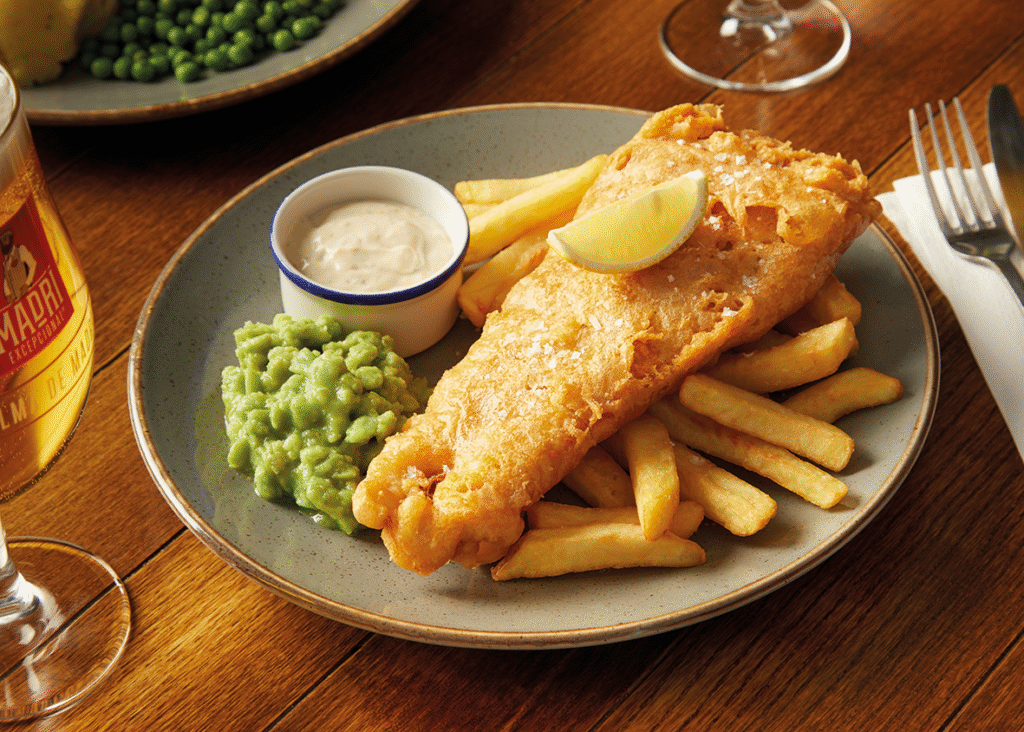 Hand-battered fish & chips, hand-battered fish fingers, served with chips and peas (†) | 4.49 712 kcals